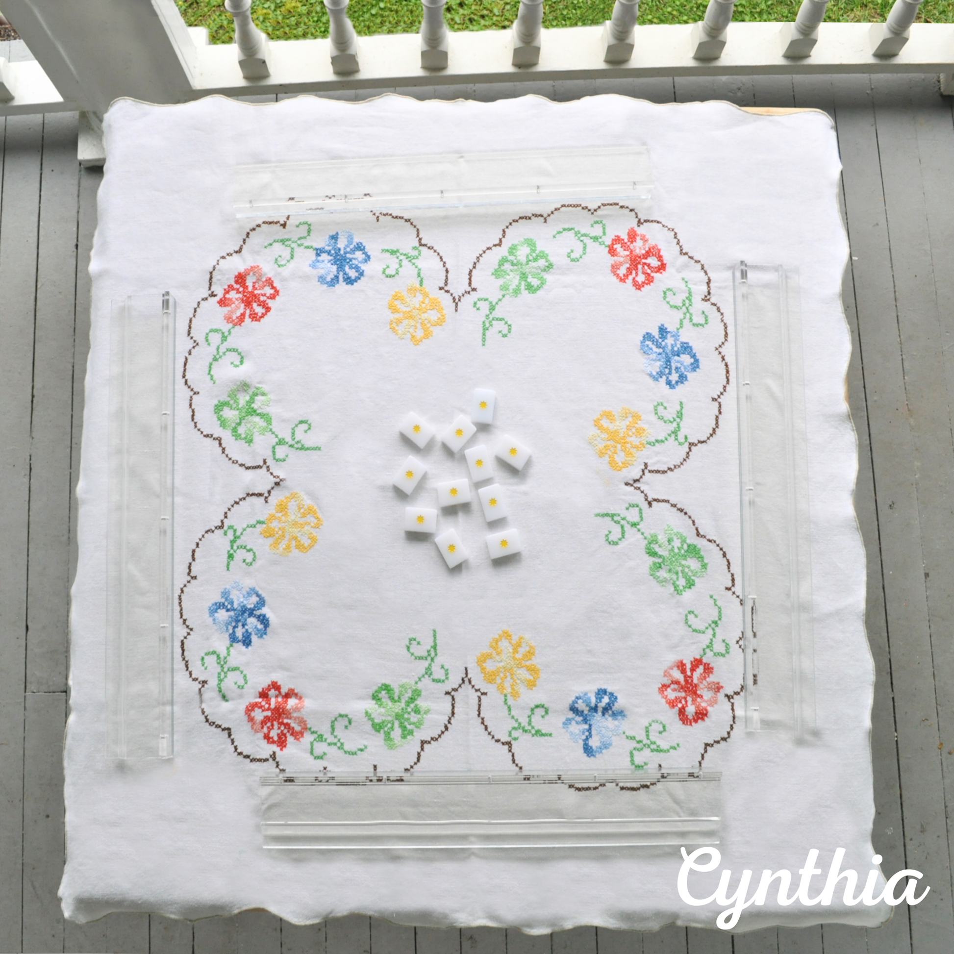 Measures 38" inches square in fine white linen, adorned with hand stitched embroidery in primary flowers & green leaves. The open area in the center is perfect for your mahjong tiles, & the scalloped edge of this linen highlights her femininity. The linen is in excellent vintage condition, with no obvious stains, holes, or tears.