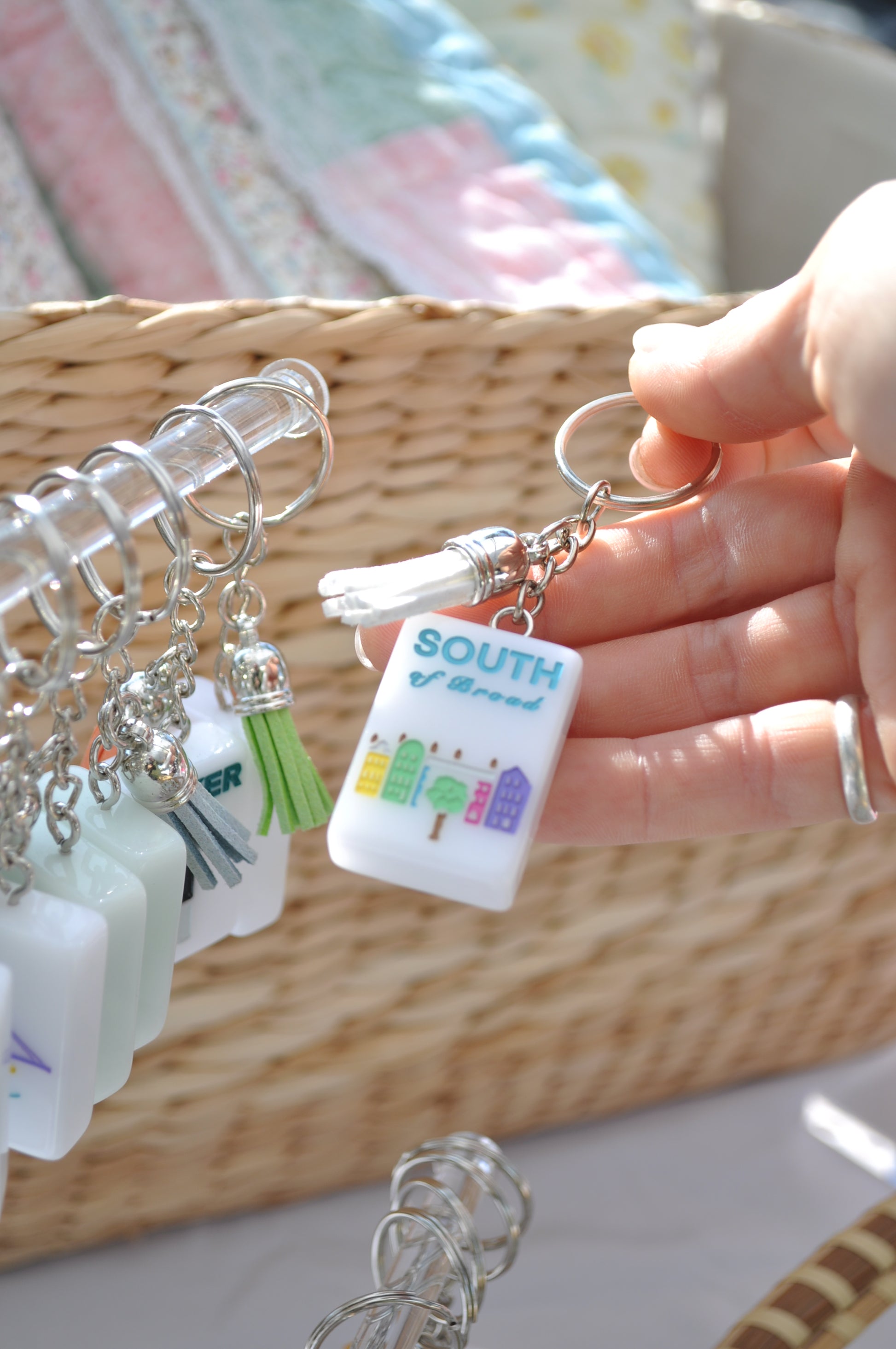 Each keychain measures 1.5" x 1" x .5" and features a cute leather tassel and keyring.