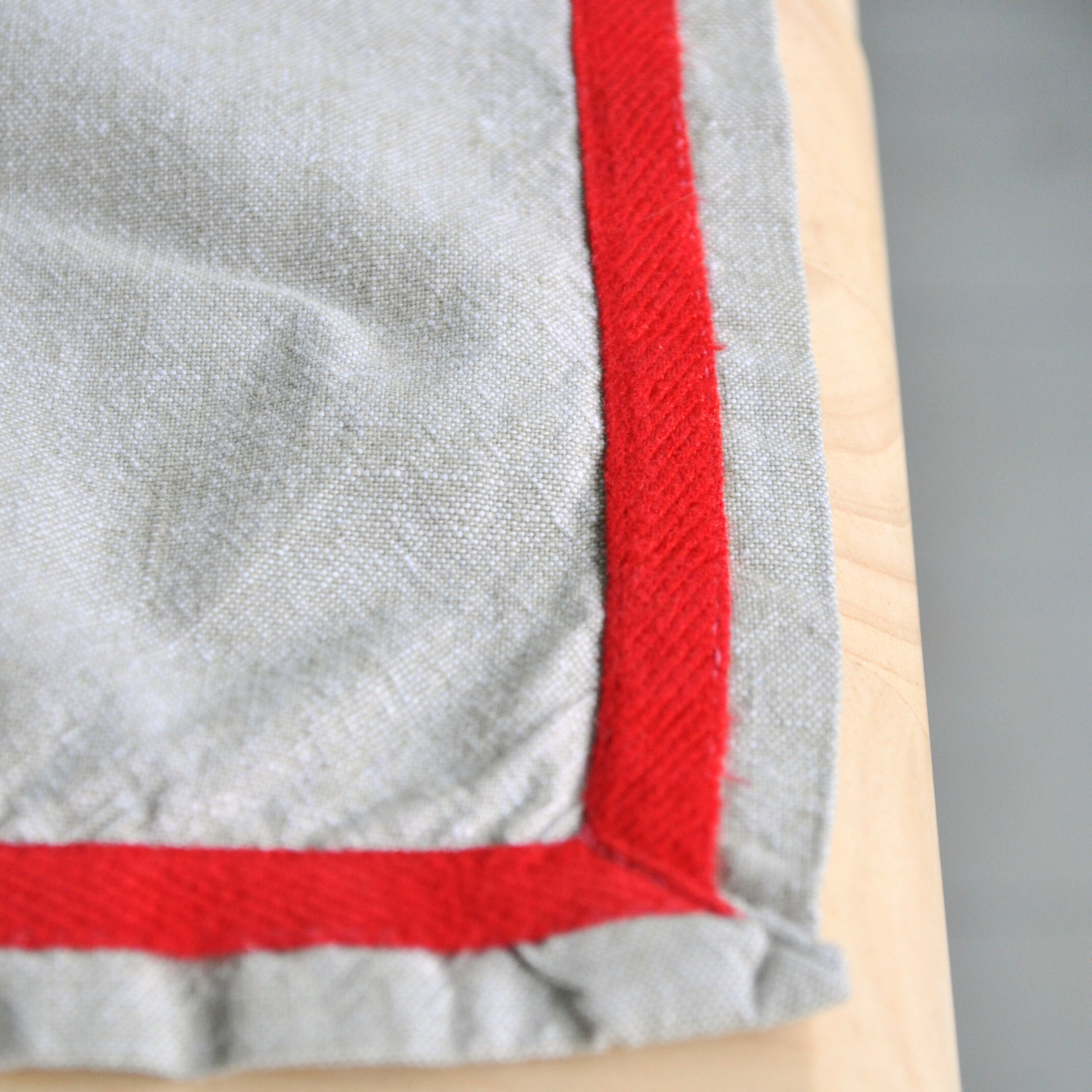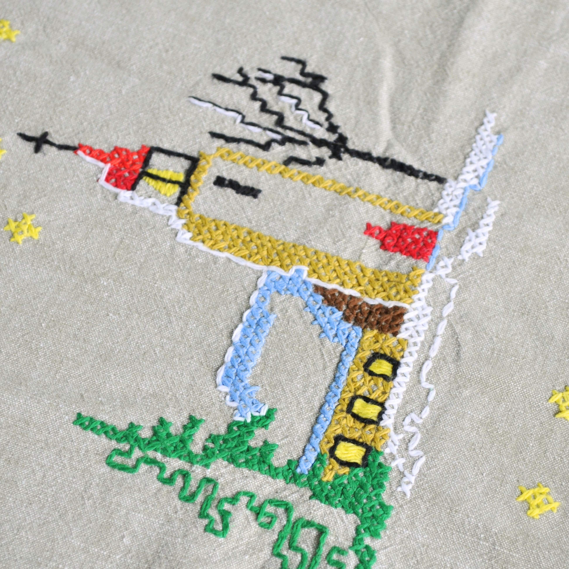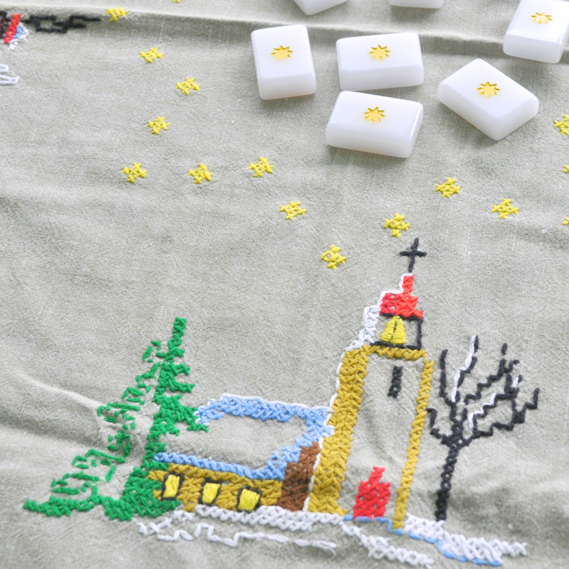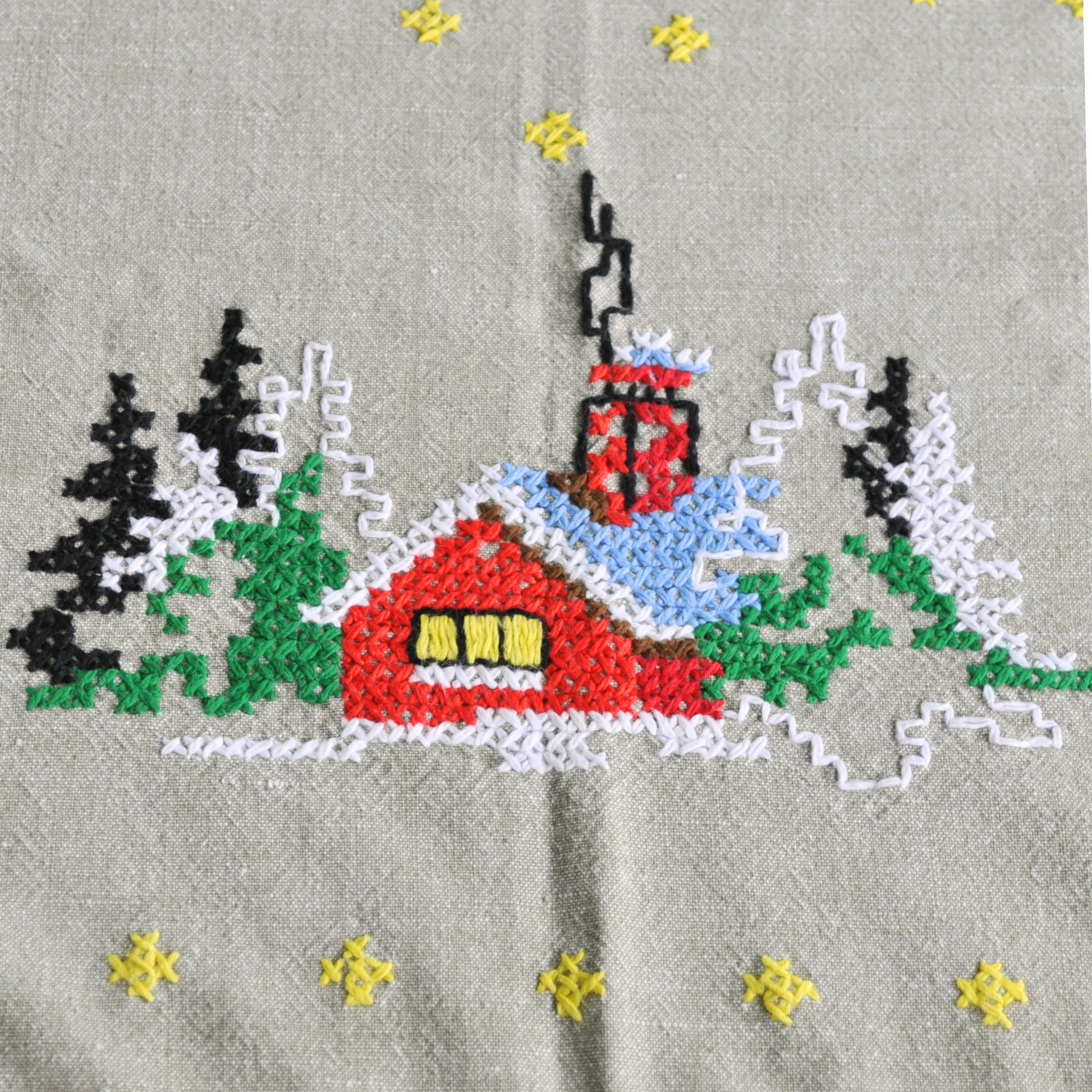 Measures 34" x 35" inches in flax linen, adorned with hand stitched embroidered in a winter’s night motif, including twinkling stars. A red border appliqué was expertly added with a home sewing machine. The linen is in excellent vintage condition, with no obvious stains, holes, or tears.